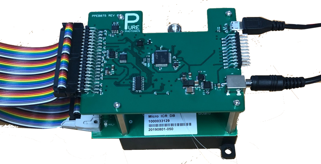 ICR control board. Provides power supplies and control signals for the micro-ICR (comparable to the motherboard). Has RS-232 (LVTTL) and micro-USB interface to allow control through programming script.